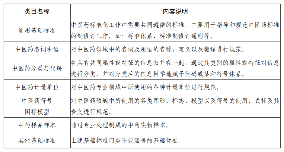 1.中医药基础标准,是指在中医药范围内作为其他类别标准的基础并普遍使用,具有广泛指导意义的标准,是技术标准、管理标准和工作标准均通用的共性标准。包含7个类目,各类目内容说明见表1。