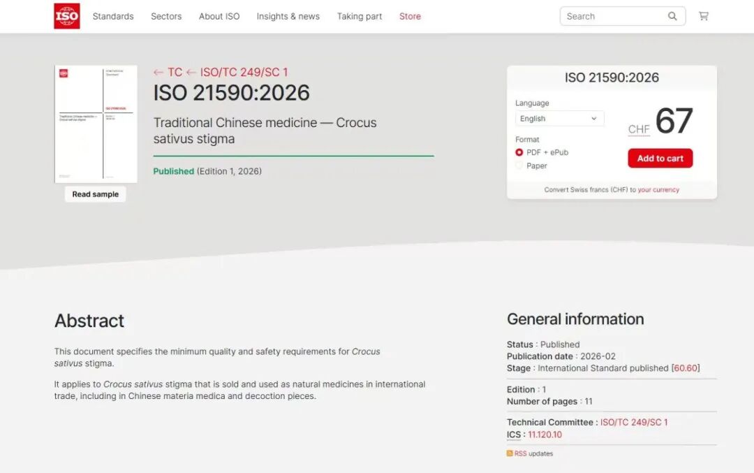 2月20日,由我省主导制定的《中医药-西红花》(ISO 21590: 2026 Traditional Chinese medicine—Crocus sativus stigma)国际标准正式发布,该标准由成都中医药大学裴瑾教授团队牵头,联合中、伊、印、西、希等多国专家合作完成,为传统名贵中药材西红花建立全球统一、权威规范的质量技术体系,标志着中医药国际标准再获重要突破。