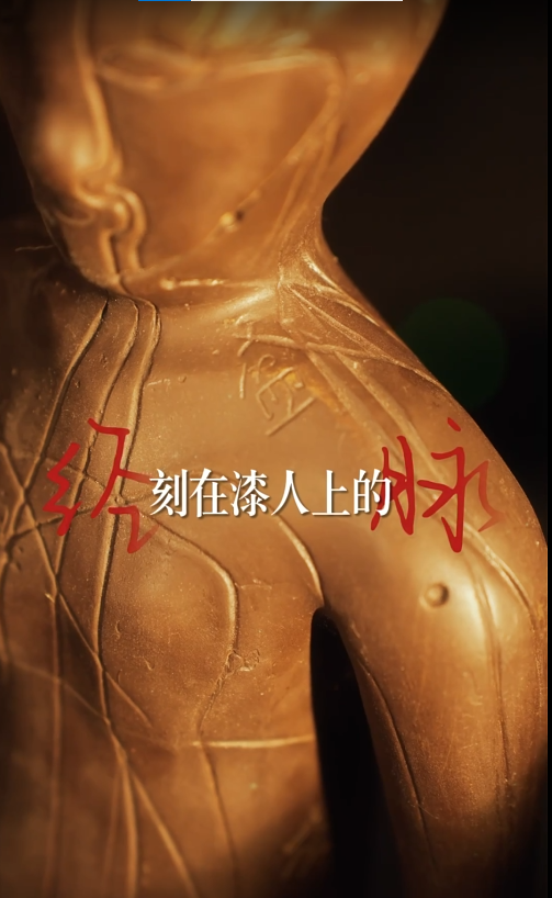 和天回医简一起出土的,还有一具14.9厘米高的髹漆经脉人像。身上刻着111个“脉口”(就是后来的腧穴),20个铭文,彩绘和刻划的经脉纵横全身,是缩小版的“人体经络图”。