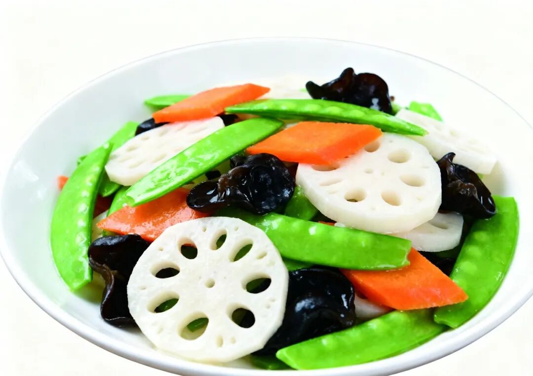 材料:荷兰豆200克,莲藕100克,木耳30克,胡萝卜50克。