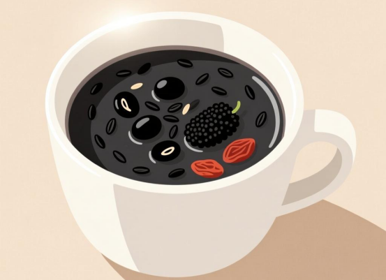 材料:黑豆、黑米、黑芝麻、桑葚干、黑枸杞。