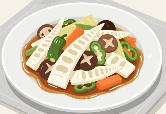 做法:冬笋150克切片焯水去除涩味,荷兰豆50克去筋,胡萝 卜30克切片。热锅加油爆香姜片,先下胡萝卜和冬笋翻炒,再加入荷兰豆,淋入少许水防止干锅,快速翻炒。待所有食材断生,加适量盐、蚝油调味即可。