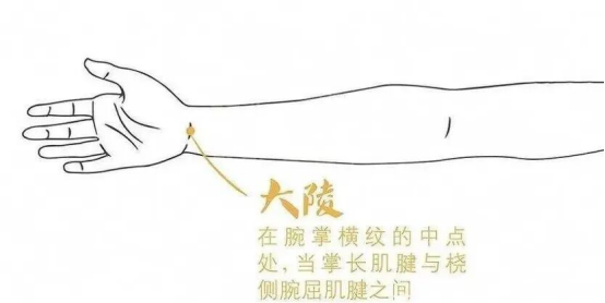 2. 大陵穴:腕掌侧横纹中间,握拳时手腕处两条明显肌腱之间。
