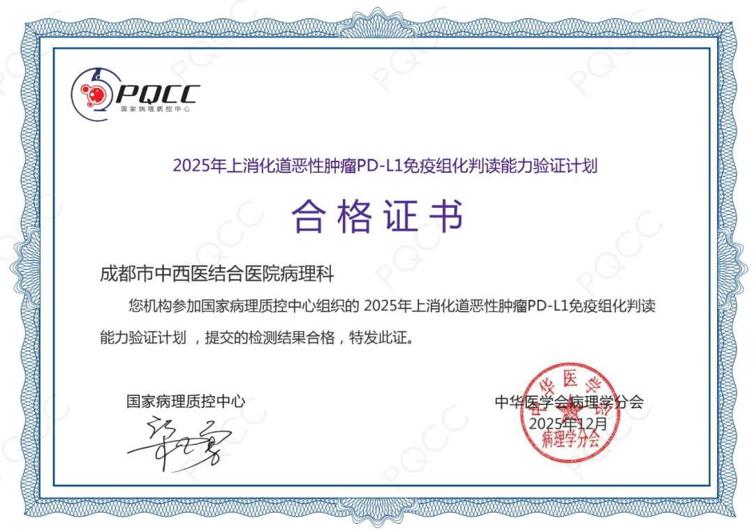 在精准医疗领域,病理科顺利通过国家病理质控中心(PQCC)“2025年上消化道恶性肿瘤PD-L1免疫组化判读能力验证”,标志着医院在肿瘤精准诊断领域保持国内先进水准,具备国家认可的专业能力,为临床个体化免疫治疗筑牢诊断基石。科室构建全链条精细化质量管理体系,以严谨规范的操作与精准判读,树立病理诊断“精准标尺”。