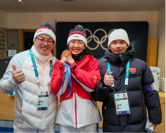 江继君主治医师、游亮亮康复师与徐梦桃赛后合影
