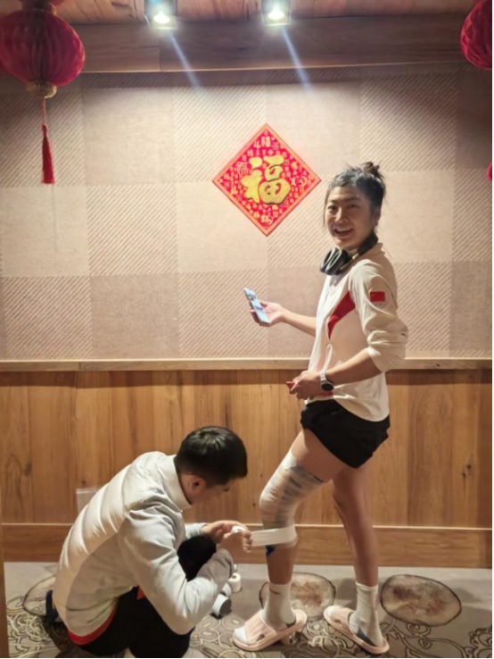 游亮亮康复治疗师为徐梦桃进行专项肌贴贴扎