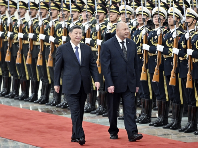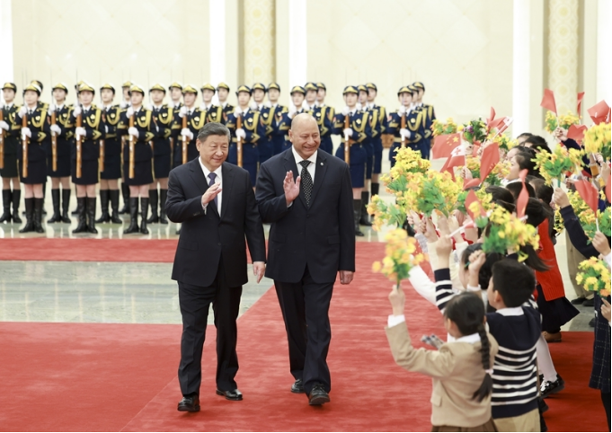 11月25日上午,国家主席习近平在北京人民大会堂会见来华进行国事访问的汤加国王图普六世。这是会见前,习近平在人民大会堂北大厅为图普六世举行欢迎仪式。新华社记者 殷博古 摄